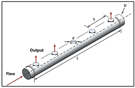 The study by Alawee, Hassan, and Mohammad (2021) [11] examined the methodology of flow uniformity at the distribution manifold inlet, which expresses the variability in the inlet area. The baseline case for these variabilities has a diameter of 100 mm, and the range is between 100 and 50 mm. The diameter of the distribution manifold (D1) was kept constant, and the flow entered the manifold at a right angle. For all cases, the inlet water flow rate was 790 L/min. The results of this study showed that the methodology of changing the cross-sectional area from the main pipe to the manifold is a negative step in the quest for flow uniformity, as the irregularity coefficient increased from 0.3 to 0.401.