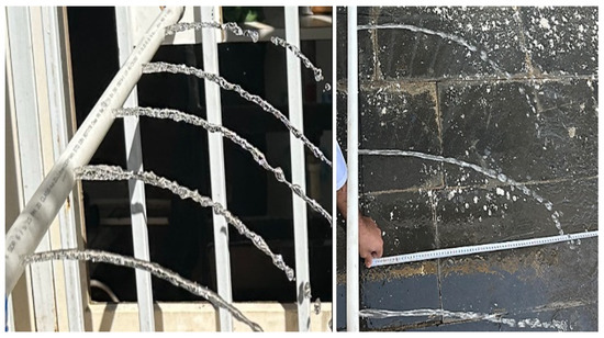 In the experimental studies, the water jet lengths corresponding to each flow rate in different manifold types at low flow rates were measured as homogeneous (close to each other in length) (Figure 11, Figure 12, Figure 13 and Figure 14).