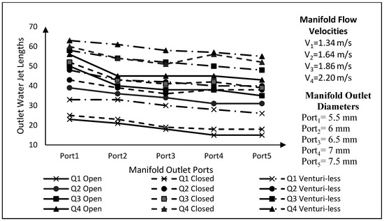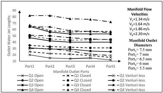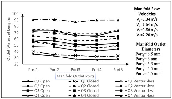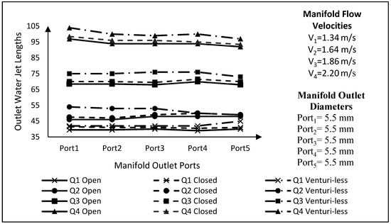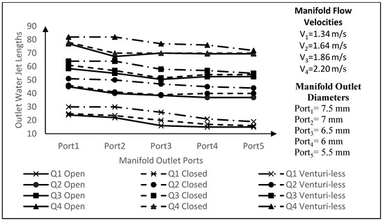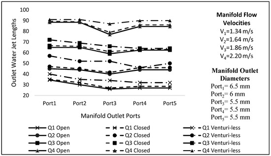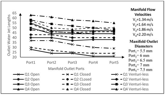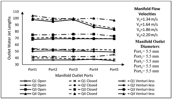 Graph of comparison of water jet lengths in Venturi Type 2 Manifold Type 4 open, closed, and Venturi deviceless systems (Q1 = 17 × 10−5 m3/s, Q2 = 20.8 × 10−5 m3/s, Q3 = 23.6 × 10−5 m3/s, Q4 = 27.8 × 10−5 m3/s).