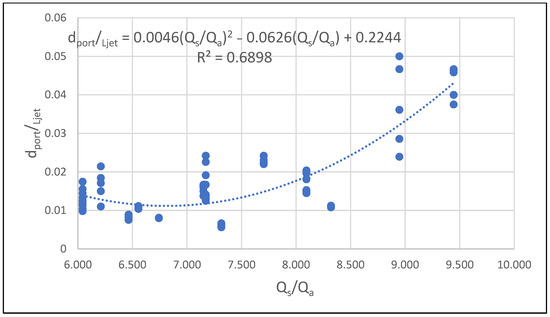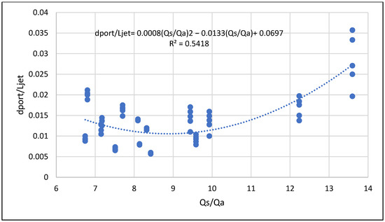 A dimensionless parameter analysis was performed on the acquired experimental data. The parameters Qs/Qa and dport/Ljet were investigated as the most suitable candidates. Consequently, the correlation coefficient R² for the equation developed for Venturi Type 1 was determined to be 0.541 (Figure 15). Measurement errors, calibration issues, and particularly jet characteristics (port exit diameter, jet breakup, jet fragmentation, and droplet formation) are believed to influence the experimental results. Moreover, the correlation coefficient R² for the equation developed for Venturi Type 2 was calculated as 0.689 (Figure 16).