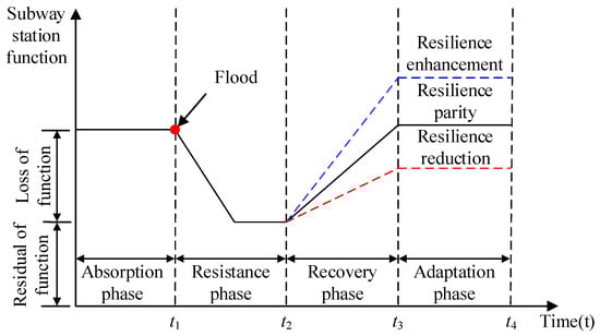 Water disasters such as heavy rain and flooding directly affect urban rail transit systems through their impact on metro stations. It is therefore necessary to investigate the factors influencing the ability of metro stations to cope with water disasters [,]. The safety resilience system of a metro station is a complex system influenced by multiple risk factors. Analyzing the mechanisms of factors affecting the water disaster safety resilience of metro stations helps enhance their resistance ability to water disasters, as well as recovery capability after incidents such as heavy rain and flooding. According to resilience theory, metro station water disaster resilience can be defined as the ability of a metro station to absorb, resist, recover from, and gradually adapt to the disturbances caused by water disasters such as flooding and heavy rain. It includes the ability to prevent emergencies, respond to emergencies, recover, and adapt to changes in the future. Metro station water disaster safety resilience can be quantified as a comprehensive ability of absorption capacity, resistance capacity, recovery capacity, and adaptive capacity []. Among them, absorption capacity refers to the ability of the metro station system to eliminate potential safety hazards and prevent water disasters, which is the ability to maintain system stability before events such as rainstorms and flooding. Resistance capacity refers to the system’s ability to minimize the impact of water disasters and reduce losses, which means during water disasters such as rainstorms and floods, the metro station ensures its normal operation through its redundancy. This is more about the emergency performance of the metro station. Recovery capacity refers to the ability of the subway station system to adjust its status promptly to ensure normal operation during water disasters, which means that after water disasters such as rainstorms and floods, the subway station can restore its normal operation status as soon as possible through the reasonable allocation of resources. Adaptability refers to the system’s ability to optimize its internal structure to improve its ability to cope with future water disasters. This means that the metro station constantly improves its resilience by learning and summarizing its experience in handling events like rainstorms and floods. The concept curve of metro station water disaster safety resilience is depicted in Figure 1.