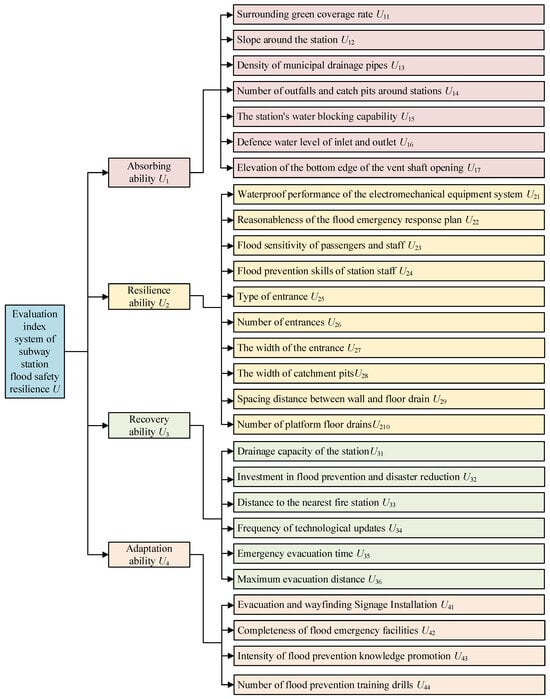 Considering the principles of feasibility, hierarchy, and systematicity, as well as the operational characteristics of metro stations and the hazardous characteristics of water disasters, this study, based on the concept of metro station water disaster safety resilience and related research [,], establishes a metro station water disaster safety resilience evaluation indicator system. This system includes 4 primary indicators (absorption capacity, resistance capacity, recovery capacity, and adaptive capacity), consisting of 27 secondary indicators. Among them, absorption capacity contains 7 evaluation indicators, resistance capacity includes 10 evaluation indicators, recovery capacity involves 6 evaluation indicators, and adaptation capacity consists of 4 evaluation indicators. The framework of the established evaluation indicator system is illustrated in Figure 2.