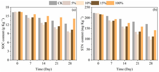 Changes in SOC and STN content with dry–wet cycles. (The data values represent the average from three replicates for each treatment, with n = 3). (a) represents SOC, and (b) represents STN.