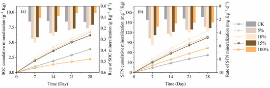 Mineralization of SOC and STN with dry–wet cycles. (The rate of mineralization is represented by a bar graph and the cumulative mineralization is represented by a point and line graph. The data values represent the average from three replicates for each treatment, with n = 3). (a) represents SOC, and (b) represents STN.