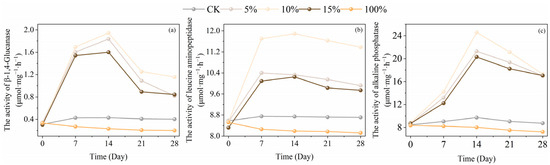 The activities of leucine aminopeptidase, β-1,4-glucomannase, and alkaline phosphatase were highest in 10% in the 28d experiment, followed by 5% and 10%, with the lowest values in 100% (Figure 4). Soil enzyme activities of 5%, 10%, and 15% increased during the first and second dry–wet cycles and then decreased. The activity of β-1,4-glucomannase and alkaline phosphatase decreased more rapidly after the second wet–dry cycle, while the decline in leucine aminopeptidase activity occurred more gradually. The activity of leucine aminopeptidase ranged from 8.12 to 11.89 μmol/mg/h, which was highest after the second dry–wet cycle of 10%. Leucine aminopeptidase activity in the different dry–wet treatments followed the order: 10% > 5% > 15% > CK > 100%. The activities of β-1,4-glucomannanase and alkaline phosphatase were similar to that of leucine aminopeptidase.
