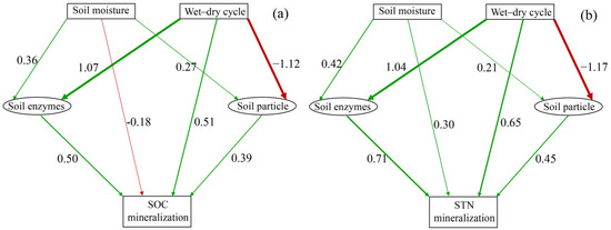 Describing the effects of dry–wet cycles on SOC and STN mineralization based on structural equations (SEM). (a) represents SOC, and (b) represents STN. The red line represents the negative impact, the green line represents the positive impact, and the line width represents the absolute value of the impact.