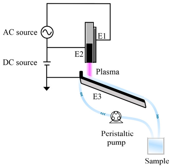The antibiotics were irradiated with non-thermal plasma generated in a trielectrode reactor operated in ambient air (Figure 2), which was designed by some of the authors of this work. The reactor is based on a surface dielectric barrier discharge (DBD) extended to a third electrode. The solution to be treated flows through a low-impedance channel, which acts as a third electrode connected to the ground, away from high-voltage DBD electrodes. A detailed description of the reactor can be found in the reference [32].