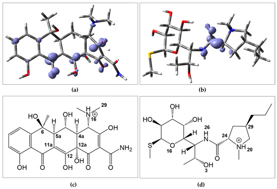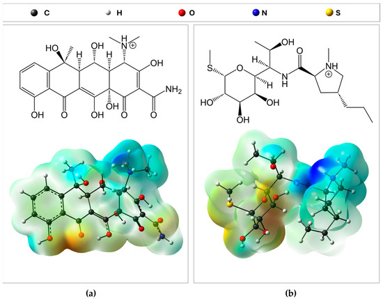 After the optimizations, the number of conformers that were within the feasibly accessible energy window (i.e., 6 kcal/mol, Supplementary Material S1 [25]) was two for OTC and five for LNC. All conformers were verified to correspond to energy minimum points and were weighted according to Boltzmann factors to determine which had the most significant contribution (Supplementary Materials, Figures S1 and S2 and Table S1). For each antibiotic, the conformer with the lowest energy is shown in Figure 3, together with their corresponding electrostatic potential mapped on the isodensity surface at a 0.004 value. In these maps, a color spectrum is used to highlight the intensity of the electrostatic potential of each region of the molecules, ranging from red (lowest electrostatic potential, associated with the maximum negative charge density) to blue (highest electrostatic potential, associated with maximum positive charge density) [36]. As expected, the maximum positive electrostatic potential corresponds to the location of the positively charged ammonium ions.