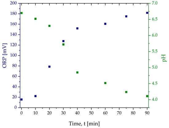 Antibiotic solutions with initial concentrations of 10 and 1 mg L−1 were irradiated with non-thermal plasma generated in a trielectrode reactor open to the air. The pH and the Oxidative Reduction Potential (ORP) were monitored during the experiment. The antibiotics solutions had an initial pH of 6.5 and decreased during the experiment until a final value of 3.5 (Figure 5) due to the generation of acidic species as a result of the antibiotics’ degradation [44,45]. In addition, the Oxidative Reduction Potential (ORP) remained positive during treatment (20 to 200 mV), which is consistent with the presence of reactive radicals of oxidative behavior [46].