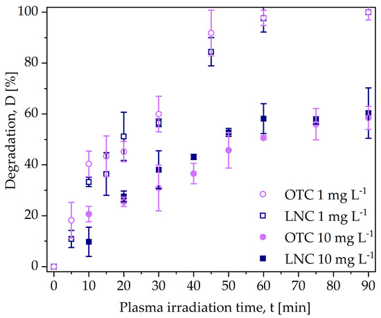 The concentration of the antibiotics in aliquots taken at different times during each experiment was determined, and the degradation percentage (D%) was calculated (Section 2.2.3, Equation (1)). The results for OTC and LNC are shown in Figure 6. Both OTC and LNC follow comparable degradation trends, with similar D% at every time. For C0 = 10 mg L−1, the maximum D% reached was approximately 60% at 90 min of treatment, whereas for C0 = 1 mg L−1, nearly complete degradation was achieved at 60 min.