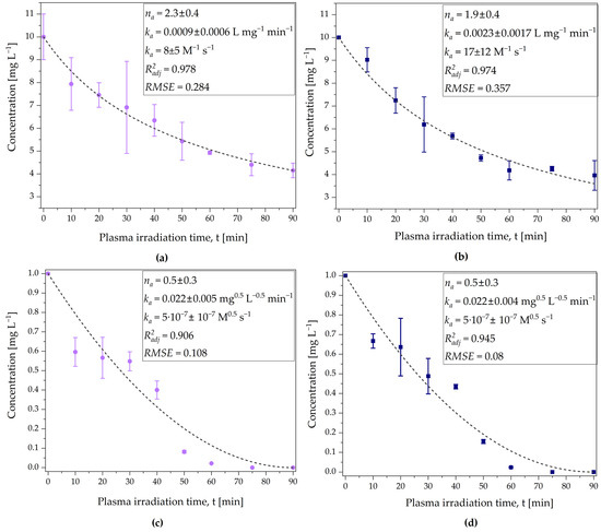 Degradation curves fitted to pseudo-order models for (a) OTC C0 = 10 mg L−1; (b) LNC C0 = 10 mg L−1; (c) OTC C0 = 1 mg L−1; (d) LNC C0 = 1 mg L−1. The obtained parameters, along with the adjusted determination coefficient (Radj2) and the root mean square error (RMSE), are shown for each case.