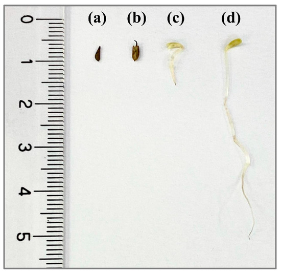 Based on the results obtained from the experiment, the germination indexes (GI%) were calculated according to Equation (8) (Experimental Details Section 2.2.3) and are shown in Figure 10.