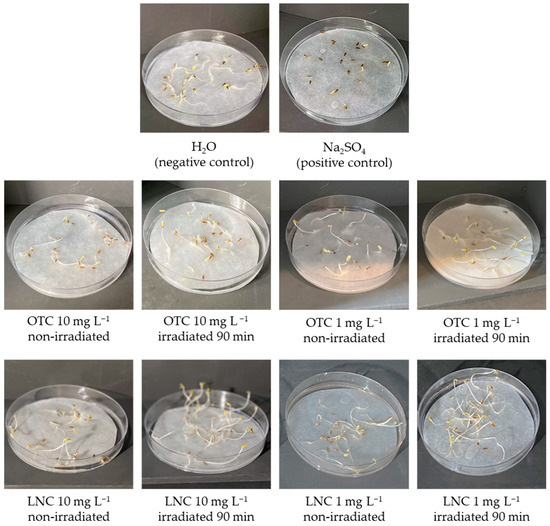 Additionally, as mentioned previously, numerous reports have pointed out that byproducts generated during plasma irradiation can be equally or even more toxic than the original compounds [24]. Therefore, the biotoxicity assessment of the OTC and LNC samples before and after the plasma treatment (for both C0 = 10 mg L−1 and C0 = 1 mg L−1) was carried out. Figure 9 shows the appearance of Lactuca sativa seeds’ growth after the 5-day experiment.
