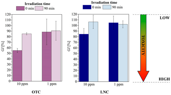 In Table 3, the number of non-germinated seeds and average radicle length are shown. As can be seen in the table, the results obtained for the irradiated samples of OTC and LNC for both 10 and 1 mg L−1 have no significant differences compared with those obtained for the negative control (H2O).