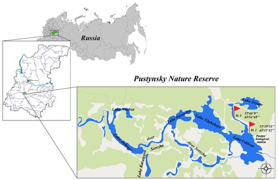 The study was carried out on Lake Velikoye and in the channel (Protoka) connecting this lake with another one (Pustynsky Nature Reserve, Nizhny Novgorod region, Russia). It is located in the center of the Russian Plain on the northwestern edge of the Volga Upland, as part of the Teshe-Serezhinsky karst region. The karst of this territory is formed by both carbonates (limestones, dolomites, and marls) and sulfates (gypsum and anhydrite). The Serezha River, the third-order tributary of the Volga River (196 km length), flows through the territory of the Pustynsky Reserve. There are eight karst lakes in the reserve connected to a single system and representing the bays of the Serezha River. The catchment areas of these lakes are mainly forested.