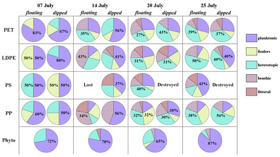 The colonization of plastic particles is dependent on environmental conditions [,]; installation conditions (surface/bottom) [,,]; or the size, topography, and roughness of the plastic substrate [,]. The initial colonization takes place in a few days or weeks, and its rate may depend on the types of plastic substrates []. In general, the first stages of the primary epiplastic community’s formation, despite the type of plastic, are similar. Over time, there is an increase in the total number of species and their abundance, as well as an increase in the dominance of some species [,,].