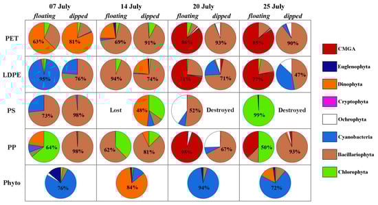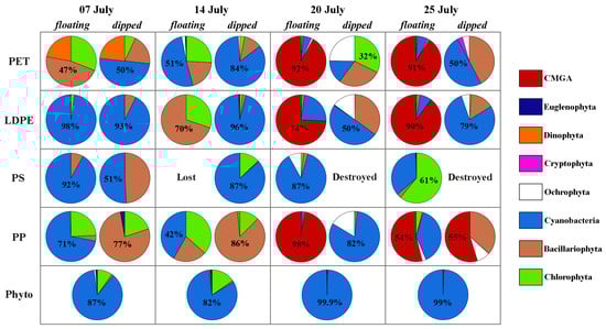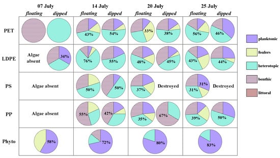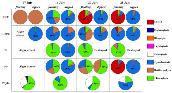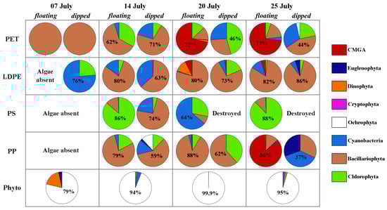 Epiplastic algal communities stand apart in water bodies and have specific features with respect to their composition. [,,,,]. It has been demonstrated that in all types of aquatic ecosystems, diatoms can be the most numerous, widespread, and diverse group of plastic colonizers [,,], accounting for up to 60% of the total species number, while cyanobacteria accounted for 25%; other groups account for no more than 15% of species composition []. It is unclear and still an open question as to whether periphytic algae assemblages are typical for certain types of polymers. Some works [,,] observed dissimilarities in algal community compositions based on distinct polymer substrates, or affinity appeared at a later date []. Others indicated the selectivity of some algae groups (for example, diatoms) in the colonization of particular polymer substrates [].