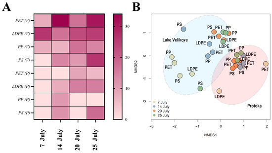 Similarity matrix (%) of the species composition of plankton algae and periphytic algae of different plastic substrates during the study period (V—Lake Velikoye; P—Protoka) (A). Visualization of the species’s composition similarity of periphytic algae (B).