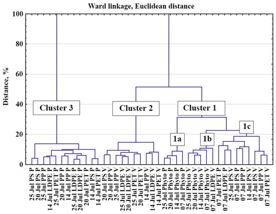 A dendrogram was constructed based on the generalized similarity matrix (using the Sørensen coefficient) of the species composition of phytoplankton and periphytic algae. In the first days of exposure (Figure 5), the composition of periphytic algae was close to the composition of phytoplankton (cluster 1). This cluster has several subgroups. Two of them (1a and 1b) combine planktonic samples of algae that float in the water column and do not colonize plastic substrates at the study time. Moreover, phytoplankton samples from Lake Velikoye and Protoka were clustered in different groups. The last subgroup (1c) clustered primary substrate colonization samples (7–14 July). This group had the closest connection with samples of phytoplankton from Lake Velikoye.