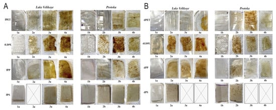 Photos of the fouling of different plastic substrates exposed on the surface (A) and 1 m deep (B) (horizon 1a, 1b—7 July; 2a, 2b—14 July; 3a, 3b—20 July; 4a, 4b—25 July).