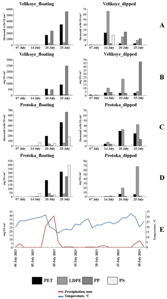 Dynamics of the abundance and biomass of periphytic algae on different types of plastic installed in the surface layer and at a depth of 1 m in Lake Velikoye (A,B) and Protoka (C,D). Precipitation (mm) and air temperature (E) (https://nuipogoda.ru/).