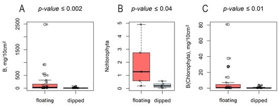 In both reservoirs, with increasing exposure time, the number and biomass of algae on plastic substrates also increased. The abundance and biomass of periphytic algae were higher for the surface installations, sometimes exceeding those on the dipped supports more than 100 times. However, despite such sharp differences, only the abundance and biomass of green-algae-colonizing floating PP plastic, as well as the values of the total biomass, turned out to be statistically different (Figure 12).