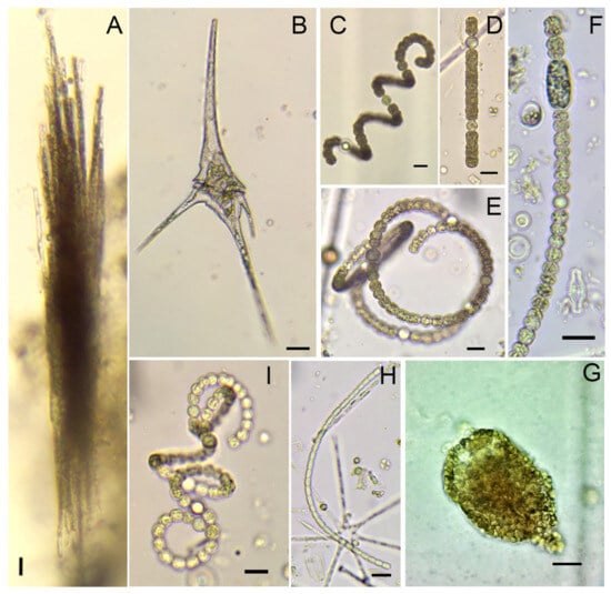Dominant species of cyanobacteria and algae in phytoplankton (scale bar is 10 µm): (A)—Aphanizomenon flos-aquae; (B)—Ceratium cf. hirundinella; (C)—Dolichospermum spiroides; (D–F,I)—Dolichospermum spp.; (H)—Pseudanabaena sp.; (G)—Gonyostomum semen.