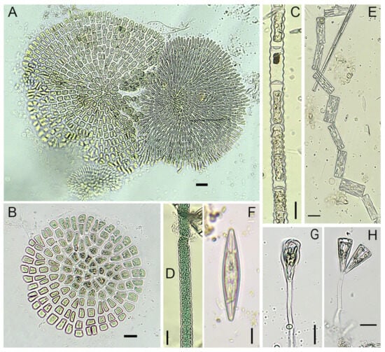 - Vodeneeva, E.L.; Kulizin, P.V. Algae of the Mordovian Nature Reserve. Annotated List of Species. Flora Fauna Nat. Reserves 2019, 134, 62. (In Russian) [Google Scholar]