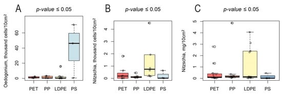 The normality of the distribution of indicators of the quantitative development (abundance and biomass) of algal communities was assessed using the Shapiro–Wilk test. The homogeneity of the distribution of algae abundance and biomass was assessed using Levene’s test. Comparisons of the abundance and biomass of Oedogonium and Nitzschia in different types of plastic substrates were performed using the Kruskal–Wallis test. Comparisons of the total biomass, biomass, and abundance of green algae in PP polymers on the surface and in deep layers were performed using the Wilcoxon test. All analyses were performed using the open-source R software, version 4.4.2 (packages “vegan” and “statistics”) [,].