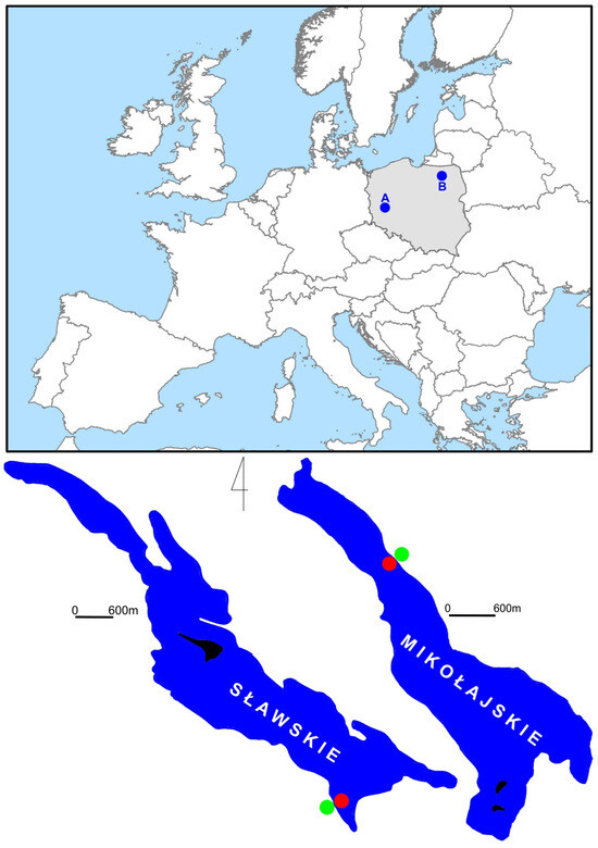 Location of study objects: Sławskie Lake (A); Mikołajskie Lake (B); blue color-lakes, red color—hydrological station; green color—meteorological station.