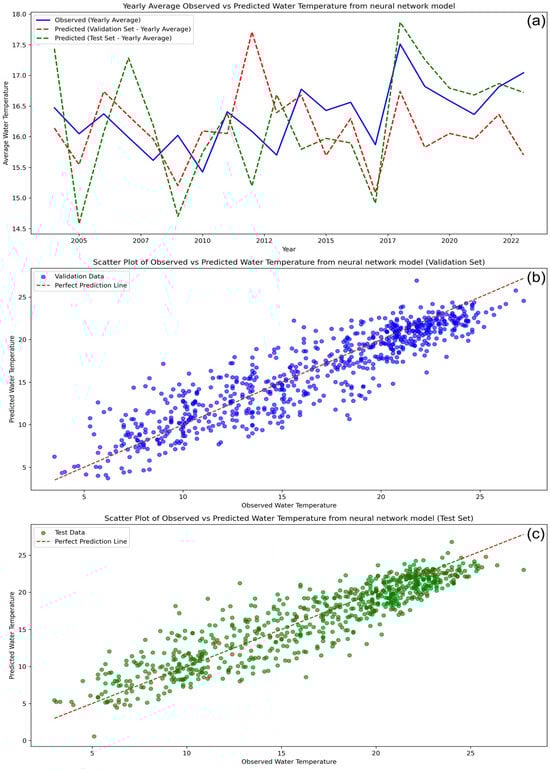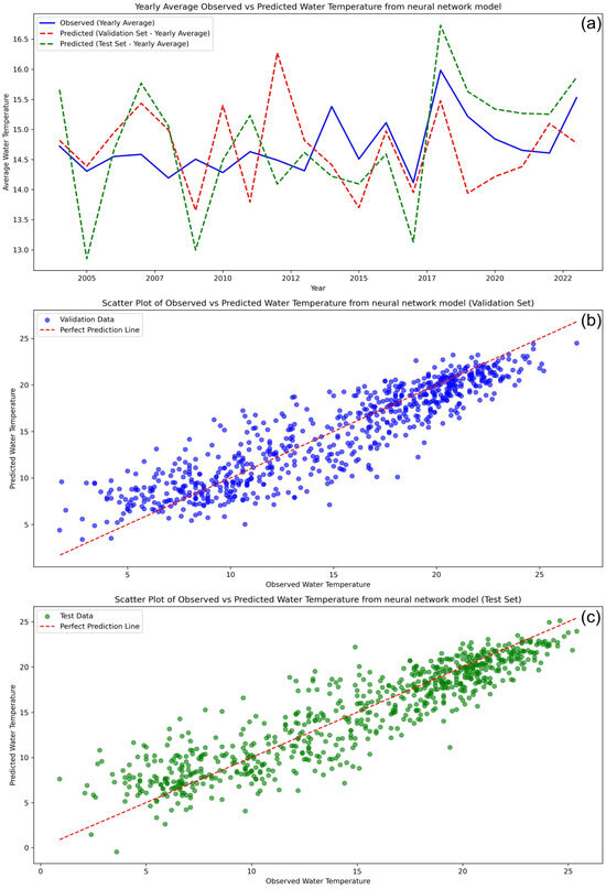 Figure 5 presents a time series comparison and scatter plots of observed versus predicted water temperatures for Sławskie Lake, generated by the neural network model developed in this study. In Figure 5a, the time series of yearly averages demonstrates that the model captures the general trends and seasonal variations in water temperature for both the validation and test sets. While the predicted values closely track the observed values, there are some discrepancies in certain years, particularly during the test period, indicating some variability. However, the overall alignment between the observed and predicted trends reinforces the robustness of the model’s performance in generalizing to unseen data. The scatter plots in Figure 5b,c provide further insight into the model’s predictive capability. Figure 5b shows a strong linear relationship between observed and predicted values in the validation set, with most data points clustered tightly around the ideal prediction line. This indicates high accuracy in the model’s predictions for the validation data, with minimal bias and variance. In Figure 5c, which represents the test set, the scatter plot shows a similar alignment, though there is a slightly broader spread of data points compared to the validation set.