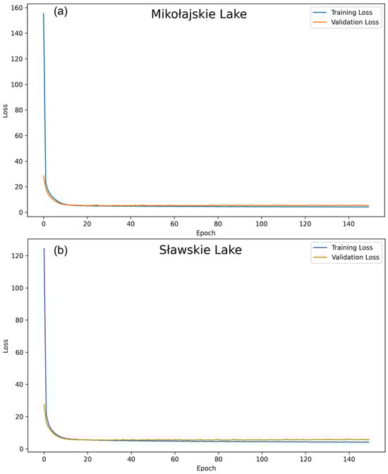 The vertical axis represents the loss magnitude, while the horizontal axis shows the number of epochs. At the start of the training process, both the training and validation losses are high, reflecting significant initial discrepancies in the model’s predictions. As training progresses, both loss values decrease sharply, indicating that the model effectively learns from the data and improves its predictive accuracy. By around epoch 20, the training loss stabilizes at a low level, showing that the model has minimized errors on the training dataset. For Mikołajskie Lake, the validation loss follows a similar downward trend, reaching a low point and then stabilizing with minor fluctuations. This pattern suggests that the model generalizes well to the validation data, as the validation loss remains close to the training loss without significant divergence. The minor fluctuations observed in later epochs likely result from variability in the validation data but do not indicate any substantial overfitting. For Sławskie Lake, a comparable trend is observed: both the training and validation losses decrease rapidly and stabilize at low values, demonstrating the model’s capacity to learn effectively from the training data. The alignment of the loss curves for both lakes indicates that the model is well calibrated, is capable of minimizing errors in training, and generalizes effectively to unseen validation data. Overall, the close alignment and convergence of the training and validation loss curves to low values suggest that the model is robust, effectively learns from the data, and maintains its generalization performance across different lakes and datasets.