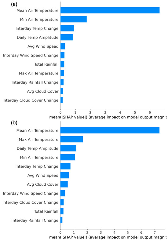 Feature importance based on SHAP values at Mikołajskie Lake (a), and Sławskie Lake (b). Mean Air Temperature: the average air temperature for the day; Maximum Air Temperature: the highest air temperature recorded during the day; Minimum Air Temperature: the lowest air temperature recorded during the day; Daily Air Temperature Amplitude: the difference between the maximum and minimum air temperatures for the day; Average Wind Speed: the average wind speed recorded over the day; Total Daily Rainfall: the total amount of rainfall recorded for the day; Average Daily Cloud Cover: the average cloud cover observed in octants (scale from 0 to 8); Interday Air Temperature Change: the change in air temperature between consecutive days; Interday Wind Speed Change: the change in average wind speed between consecutive days; Interday Rainfall Change: the change in total daily rainfall between consecutive days; Interday Cloud Cover Change: the change in average cloud cover between consecutive days.