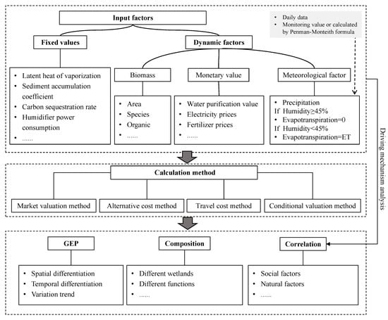 Being a crucial area for ecological conservation, wetland ecosystems provide vital functions such as flood control and storage, water purification, climate regulation, water conservation, and species preservation []. These functions play a significant role in maintaining ecological equilibrium and fostering sustainable and robust economic development. Nonetheless, wetland ecosystems are exceedingly delicate, being susceptible to change, degradation, and even extinction. As human activities intensify, conflicts between wetland preservation and exploitation become increasingly apparent []. The precise scientific computation of wetland GEP alongside its temporal and spatial driving mechanisms holds benefits not only for the safeguarding and management of wetland ecosystems but also for advancing sustainable development across the economy, society, and environment. Assessing wetland GEP has garnered focused attention from both governmental bodies and the scientific community. Various studies have already explored wetland GEP assessment, with some concentrating on categorizing and valuing specific functions of wetland ecosystem services [,,,], while others have comprehensively investigated the value of wetlands within different regions of China []. Regardless of the approach taken, these evaluations encompass essential wetland ecological functions such as climate regulation, flood control and storage, and species conservation. However, distinct researchers possess individual subjectivity in their comprehension of wetland ecosystem service functions, leading to the adoption of diverse assessment methodologies and data sources. Consequently, the calculated ecological service value per unit area in different studies exhibits significant disparities []. Therefore, the need for comprehensive technical guidelines for the statistical accounting of wetland GEP has become pressing, with the goal of providing a consistent framework from top to bottom.