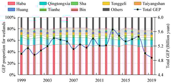 The total GEP and its proportion across various wetlands in Ningxia province are illustrated in Figure 3. The annual average GEP for Ningxia province amounts to CNY 5.24 billion. Influenced by meteorological conditions, the GEP of Ningxia province’s wetlands varies slightly from year to year. The peak GEP value reached CNY 5.66 billion in 2013, while the trough was CNY 4.87 billion in 2019. These disparities in GEP are attributed to the differences in wetland areas, geographical locations, and meteorological conditions. Notably, the Haba wetland exhibited the highest average GEP proportion at 0.52, followed by Qingtongxia, Sha, and Tenggeli, with average proportions of 0.12, 0.04, and 0.03, respectively. The remaining 31 wetlands collectively had an average GEP ratio of 0.2.