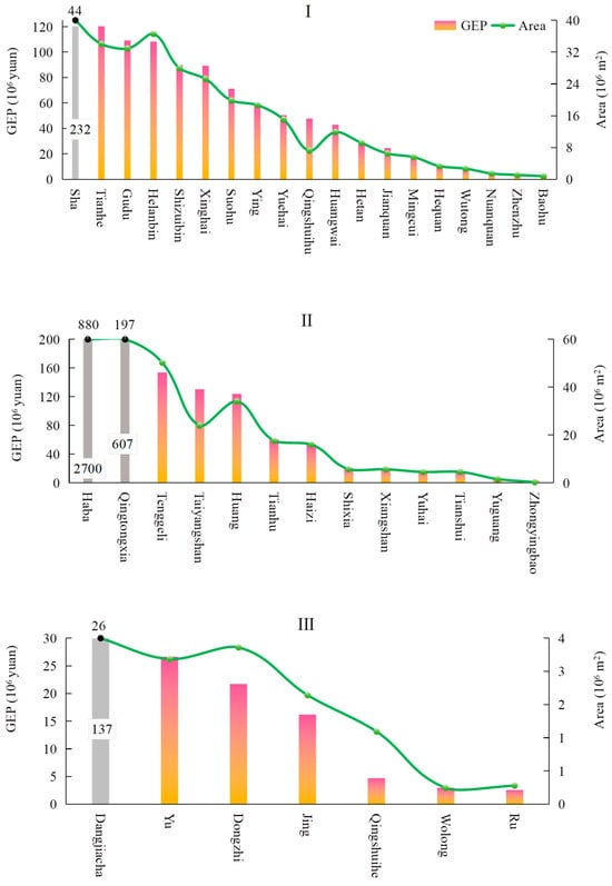 The area and average GEP values for different wetlands (to more effectively highlight their distinctions, the values of Sha, Haba, Qingtongxia, and Dangjiacha are displayed in their actual figures).