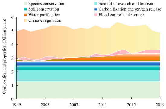 The trend in and composition of wetland GEP in Ningxia province from 1999 to 2019 are depicted in Figure 5. Wetlands possess a robust capacity for climate regulation, primarily due to their significant heat storage and vaporization capabilities, which effectively lower ambient temperatures and increase air humidity. On average, the value of their climate regulation function is the highest, constituting 38.24% of the total wetland GEP. During periods of hot weather, wetlands release substantial quantities of water vapor via evaporation and transpiration, thereby lowering the temperature of the surrounding area and mitigating the heat island effect. In 2005, Ningxia province experienced a severe drought, with an average rainfall that was just 56% of the norm. Against this backdrop, the value of the climate regulation function peaked, estimated at CNY 2.35 billion. In contrast, the climate regulation value in 2019—a year with abundant rainfall—was a mere 53.23% of that in 2005.
