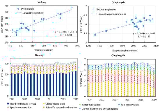 Wetlands rely on a variety of natural conditions, encompassing hydrological and climatic factors. For instance, the volume of precipitation plays a pivotal role in maintaining surface water reserves which, in turn, influences groundwater replenishment and the overall quality of the wetland’s aquatic environment. This investigation elucidates the effects of precipitation and evapotranspiration on the GEP of various wetlands, as depicted in Figure 6. In the northern regions, the mountainous terrain contrasts sharply with the southern wetlands. The significant geographical and meteorological disparities across these wetlands result in varying factors influencing their ecological service functions. The Wolong wetland, situated in the southern part of Ningxia province, exhibits a strong positive correlation between its GEP and precipitation, primarily due to substantial variations in rainfall and seasonal inundations. Notably, this correlation is quite robust, with a correlation coefficient of 0.82. Flood control and storage is the predominant ecological service function of the Wolong wetland. From 1999 to 2019, the value of flood control and storage constituted an average of 71.34% of the total GEP. Conversely, the Qingtongxia wetland, which is situated in the northern region of Ningxia province, displays distinct ecological traits. The geographical position of the Qingtongxia wetland reduces the likelihood of flooding, yet its dry climate underscores its critical role in climate regulation. Research has indicated a positive correlation between GEP and evapotranspiration in the Qingtongxia wetland, with a correlation coefficient of 0.52. Climate regulation is the leading ecological service function of the Qingtongxia wetland. Between 1999 and 2019, climate regulation accounted for an average of 42.66% of the total GEP. Consequently, to ensure the effective protection and management of these wetland resources, it is imperative to take into account their unique geographical and meteorological conditions and to develop tailored conservation measures and management strategies. Studies on the GEP in the existing literature have not deeply discussed the effects of rainfall and evapotranspiration on the GEP of wetland; however, studies on their regulatory functions, such as flood control and climate regulation, are relatively abundant and so they are still comparable to a certain extent. In most studies, the regulatory function of wetlands was found to occupy a large proportion. For example, the contribution rate of the climate regulation function for the Dianchi Lake wetland in southern China has been reported to be as high as 90.0% []. Evaluation results for the Yellow River Delta wetland show that due to its unique coastal geographical location, the regulation functions of wave protection and flood control and storage account for 54.59% of the total value []. In the Beijing–Tianjin–Hebei urban agglomeration, which is located in the core region of China, the function of flood control and storage accounts for 75% of the total value [].