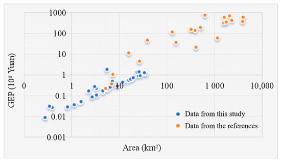 This study conducted an analysis of 21 literature sources on the evaluation of wetland ecological service values in China [,,,,,,,,,,,,,,,,,,,,], allowing for a correlation between value and area to be established (Figure 7). The unit values of wetlands ranged from 2.96 to 116.5 CNY/m2, with an average of 15.82 CNY/m2. In the case of wetlands in Ningxia province, the values ranged from 2.96 to 8.7 CNY/m2, with an average of 4.13 CNY/m2. Due to variations in data sources, statistical methodologies, and specific algorithms employed in different evaluation methods, the calculated ecological service values for diverse wetlands vary. In studies focused on the Sanchahe wetland and the Nanhu wetland, the GEP per unit wetland area was 4.1 [] and 5.1 [] CNY/m2, respectively, which is similar to the average value in this study. However, in studies of the Yeya Lake wetland and the Beijing Olympic Forest Park constructed wetland, the GEP per unit area of wetlands was 116.5 [] and 115.1 [] CNY/m2, respectively, which is 28 times higher than the average in this study. The strong correlation coefficient of 0.8521 between the area and value indicates that wetland area predominantly influences the preservation of wetland GEP. Previous studies have evaluated the close relationship between wetland area and GEP; for example, the correlation coefficient between GEP and area for the Dianchi Lake wetland in southern China was found to be 0.998 []. Only within a certain area can the stability of wetland habitats be upheld, ensuring a suitable living environment for numerous animals and plants. Larger wetland areas typically offer a greater abundance of ecological services, whereas smaller wetlands are less capable in this regard. Consequently, safeguarding and rejuvenating wetland areas is crucial for sustaining and enhancing their ecological service functions. In our analysis, we meticulously considered a range of factors, such as meteorological conditions, geographical location, and other influences on wetland GEP. For instance, in the drier northern climates, factors such as flood control and water storage were not taken into account. By doing so, the GEP values obtained are more reflective of reality and can more accurately depict the actual productivity of wetlands within a given environment. Thus, the findings indicate that the GEP per unit area of wetlands was relatively low in our study.