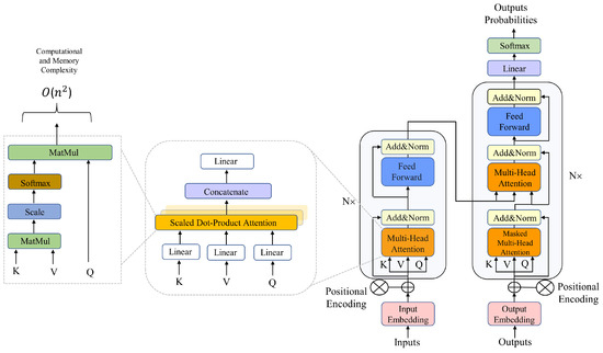 The Transformer model is divided into two main components: the encoder on the left and the decoder on the right. The encoder comprises N = 6 identical layers, each containing two sub-layers: a multi-headed self-attention mechanism and a fully connected feed-forward neural network. The decoder replicates this structure with six identical layers; however, each layer in the decoder incorporates three sub-layers. The first two sub-layers are akin to those in the encoder, while the third sub-layer focuses on attention between the encoding and decoding processes. Residual connections and layer normalization are applied to each sub-layer in the Transformer. Figure 3 illustrates the Transformer model’s architecture.