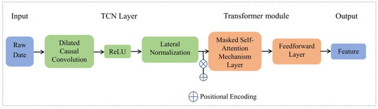 From the perspective of long-term dependencies, water level data typically contain long-term seasonal and cyclical patterns. TCN can effectively capture these long-term dependencies through its dilated convolutions, while the Transformer’s self-attention mechanism can learn dependencies between time points on a global scale, enabling the model to understand and utilize these complex temporal dynamics. From the perspective of understanding local patterns, the convolutional structure of TCN is well suited for capturing local time series patterns, such as short-term water level fluctuations. These randomly occurring local patterns are crucial for understanding water level characteristics and making reasonable forecasting, especially during extreme weather events. In terms of improving forecasting accuracy and robustness, coupling TCN and Transformer can enhance the model’s forecasting accuracy and robustness. TCN provides efficient learning of local features in the time series, while Transformer enhances the understanding of global dependencies. This combination makes the model more flexible and robust in facing different forecasting challenges. From the perspective of reducing training difficulty, the inclusion of TCN can alleviate the burden on the Transformer model when processing long sequences, thereby reducing training difficulty and improving training efficiency. TCN reduces the length and complexity of the sequence through local convolution operations, enabling the Transformer to learn key information in the sequence more effectively. In summary, the TCN–Transformer coupled model effectively predicts upstream water levels by leveraging the strengths of both architectures. This coupled model can more comprehensively and accurately capture the complex dynamics of water level changes, thereby providing important support for water resource management, flood warning, and water conservancy planning. Figure 4 illustrates the TCN–Transformer coupled model.