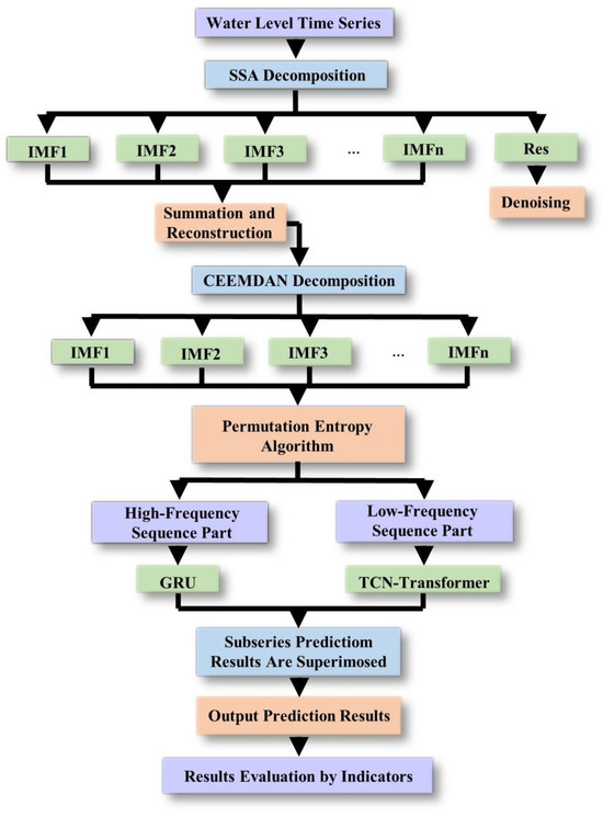 To address the nonlinear and non-stationary characteristics of the upstream water level data, this study proposes an analysis method combining Singular Spectrum Analysis (SSA) and Complete Ensemble Empirical Mode Decomposition with Adaptive Noise (CEEMDAN). This approach involves a process of data decomposition, denoising, reconstruction, and further decomposition to obtain high-quality IMF subsequences. The PE algorithm is then used to divide each modal component into high-frequency and low-frequency sequences. The GRU and TCN–Transformer models are employed to predict these two parts separately, which reduces the forecasting error of each component, improves overall forecasting accuracy, and enhances forecasting stability. This method provides a scientific basis for water resource management and forecasting.