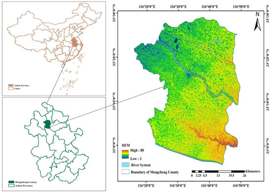 Mengcheng County, under the jurisdiction of Bozhou City in Anhui Province, People’s Republic of China, is located in the western part of the province, bordering Henan Province. It occupies the junction between Anhui and Henan. The county lies at the western edge of the Huaihe River Basin, with geographical coordinates ranging from 116°15′43″ E to 116°49′25″ E and 32°55′29″ N to 33°29′04″ N. Mengcheng County covers a total area of approximately 2091 square kilometers. Its topography is predominantly plain, especially in the eastern and southern regions, while the western and northern regions exhibit some undulation, as shown in Figure 6.