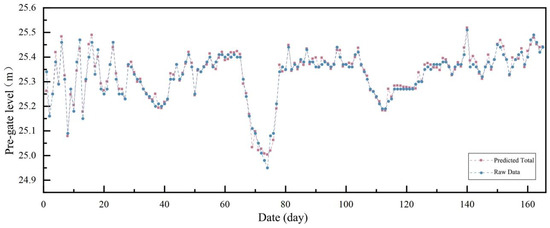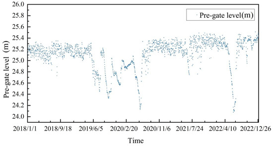 The water level measurements utilized in this research are sourced from daily monitoring at the Mengcheng Water Conservancy Hub, covering the period from 1 January 2018, to 31 December 2022, and encompassing a total of 1826 days. The upstream water level data are shown in Figure 8. The maximum water level is 25.51 m and the minimum is 24.08 m. From the original data, it can be observed that the water level fluctuates between 25.0 m and 25.8 m without extreme variations. From the beginning of 2018 to early 2020, the water level remained relatively stable, oscillating slightly around 25.2 m. From early 2020 to mid-2021, there was a slight downward trend, particularly around 20 February 2020, when a notable decrease in water level occurred. From mid-2021 to the end of 2022, the upstream water level stabilized again, with a slight increase in fluctuation range but without any drastic changes. Overall, the upstream water level demonstrates a relatively stable state.