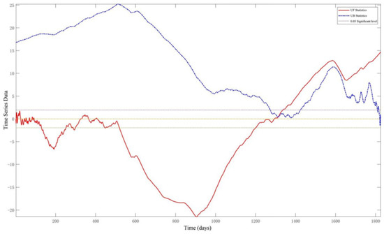 In hydrological research, the Mann–Kendall (MK) trend test on historical upstream water level data offers significant advantages [35]. As a non-parametric statistical method, the MK test does not rely on distributional assumptions of the data, which makes it highly adaptable when dealing with environmental and hydrological data, especially when the data do not follow a strict normal distribution. Under a significance level of 0.05, a Mann–Kendall (MK) trend test was conducted on the original upstream water level data, with the results shown in Figure 9. The MK test results for the upstream water level data indicate that the UF statistic (red solid line) shows an insignificant trend during the early period of the study but then rapidly decreases, entering the significant region. Subsequently, the UF statistic demonstrates a significant upward trend until it intersects with the UB statistic (blue dashed line) in the later part of the time series (around 1300 days), indicating a significant moment of trend reversal. The UB statistic displays an opposing trend to UF for most of the time but also enters the significant region towards the end of the series, intersecting with the significant upward trend of the UF statistic. Both lines fluctuate around the significance level line (yellow dashed line) at 0.05, indicating that the upstream water level experienced significant fluctuations during the study period. Particularly toward the end of the time series, the crossing of UF and UB signifies a notable change in the water level trend. In summary, the upstream water level has undergone significant trend changes over the past five years, which may be related to regional water regulation policies.