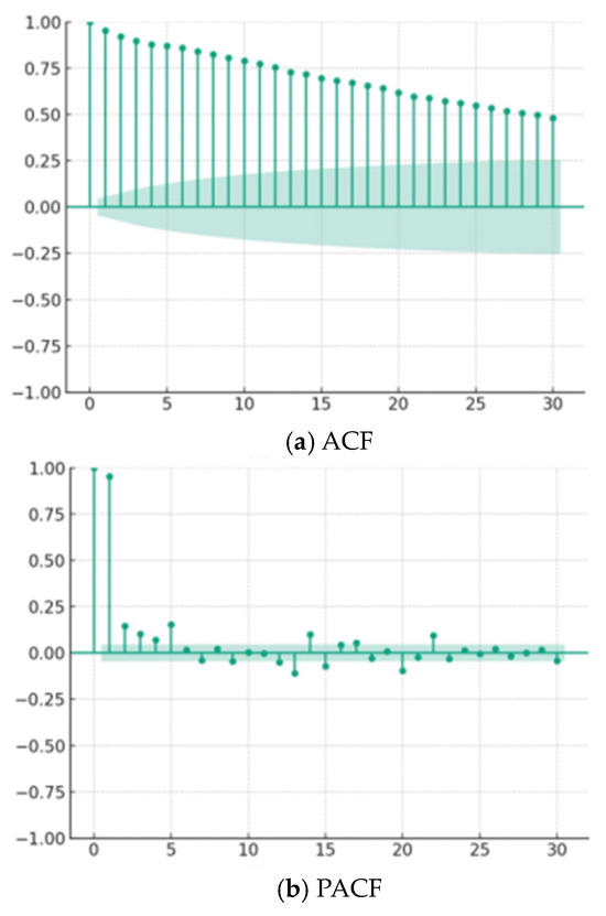 ACF measures the correlation between a time series and its lagged versions, essentially revealing the relationship between current observations and past values [38]. The ACF calculation involves several steps: first, the mean of the entire series is computed; for each lag k, the covariance between the series and its lagged version k is calculated. Then, this covariance is divided by the variance of the series to obtain the autocorrelation coefficient, which ranges from −1 to 1, where 1 indicates perfect positive correlation, −1 indicates perfect negative correlation, and 0 indicates no correlation.