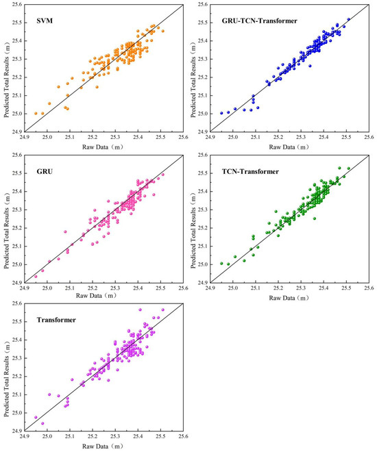 To empirically evaluate the effectiveness of the GRU–TCN–Transformer coupled precipitation forecasting model, this study also developed four alternative predictive models for comparative analysis. These models include the Support Vector Machine (SVM) model, the GRU model, the Transformer model, and the TCN–Transformer combined model. All models maintain consistent input conditions and parameter optimization, with the results obtained from the two-stage SSA-CEEMDAN decomposition used as input values. The comparison results of each model are shown in Figure 15, where each subplot displays the relationship between actual values and model forecasting in the form of scatter plots, with the black diagonal line representing the ideal case of perfect forecasting. It can be observed from the figure that the forecasting of all models is closely distributed around the diagonal line, indicating the accuracy of the model forecasting. Among them, the GRU–TCN–Transformer combined model has the most compact point distribution near the diagonal line, suggesting that this model outperforms the others in forecasting performance. Additionally, the scatter points for the SVM and Transformer models are more dispersed, indicating slightly lower forecasting accuracy.