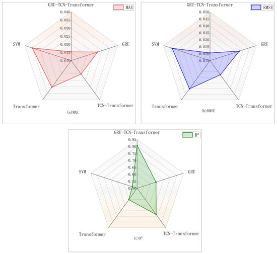 As shown in Table 1, the MAE and RMSE of the single SVM model are the largest, and the value is the smallest, indicating that its forecasting performance is the worst. Compared to the single models GRU, Transformer, and SVM, the combined TCN–Transformer model significantly improves forecasting accuracy, with MAE decreasing by 33.01%, RMSE decreasing by 31.17%, and increasing by 0.1314. When comparing the GRU–TCN–Transformer model with the combined TCN–Transformer model, MAE decreases by 24.14%, RMSE decreases by 25.72%, and increases by 0.0747. Among all models, the GRU–TCN–Transformer model exhibits the best forecasting performance, with an MAE of 0.0154, an RMSE of 0.0205, and an of 0.8076. The of the GRU–TCN–Transformer model exceeds 0.8, and it has the smallest MAE and RMSE values, indicating that this model has high reliability [34]. A comparison of the various metrics is shown in Figure 16.