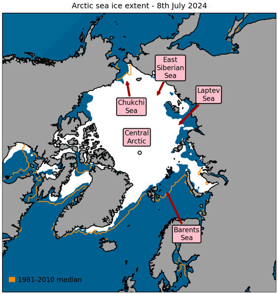 Arctic Sea ice extent on 8 July 2024, with 1981–2010 average extent indicated in orange [15]. Note that the Barents Sea was free of ice in mid-2024. The Norwegian Sea, along the coast of Norway to central Norway, is never covered with ice. Larger parts of the Barents Sea are ice-covered during the winter and spring. This includes the marginal ice zone, which is the transition zone between open waters and sea ice, where the sea ice concentration is between 15% and 80%; see [16] for a discussion of the ice cover of parts of the Barents Sea.