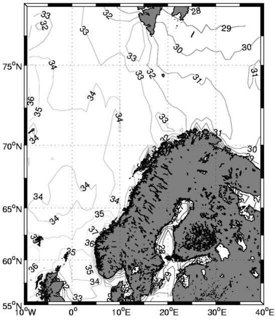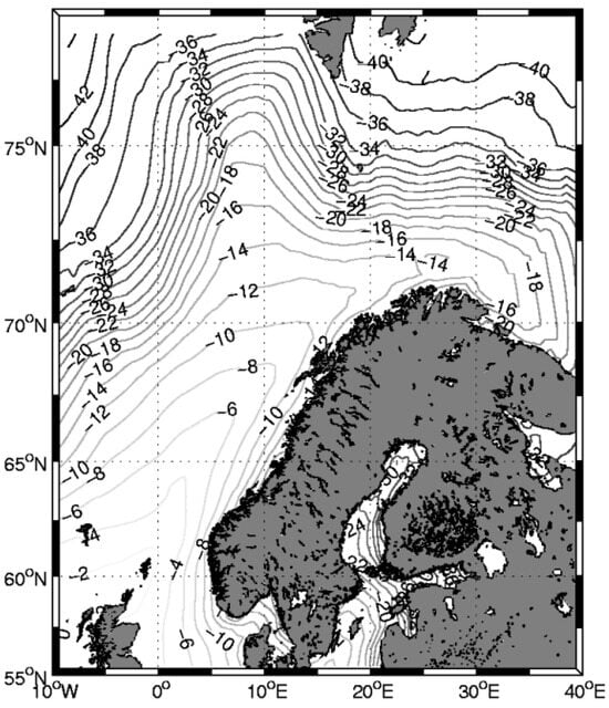 Although seawater freezes at −1.8 °C, the temperatures above the unfrozen sea can be very low during the winter. Above the frozen sea, the temperatures are normally colder, as no heat is transferred from the seawater. For a map of the extremely low temperatures in the Barents Sea, see Figure 2 [17]. The map also covers the Norwegian Sea and the North Sea, which is towards the south. At the ice edge, rising warmer air above the water causes the creation of a low air pressure, whereby cold air from above the ice sheet will move towards the low-pressure location; a polar low pressure is formed [18]. When the air temperature is below −40 °C, cold-resistant steel must be used for all facilities staying above the water surface (including the superstructure of all vessels).